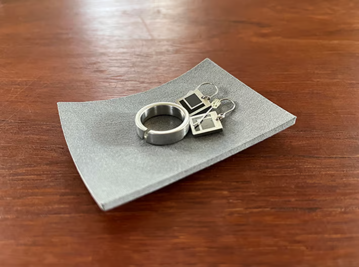 The 3D printed dish is available in multiple materials, including plastic, sandstone, and steel. By placing a custom order, you can also personalize this piece!
