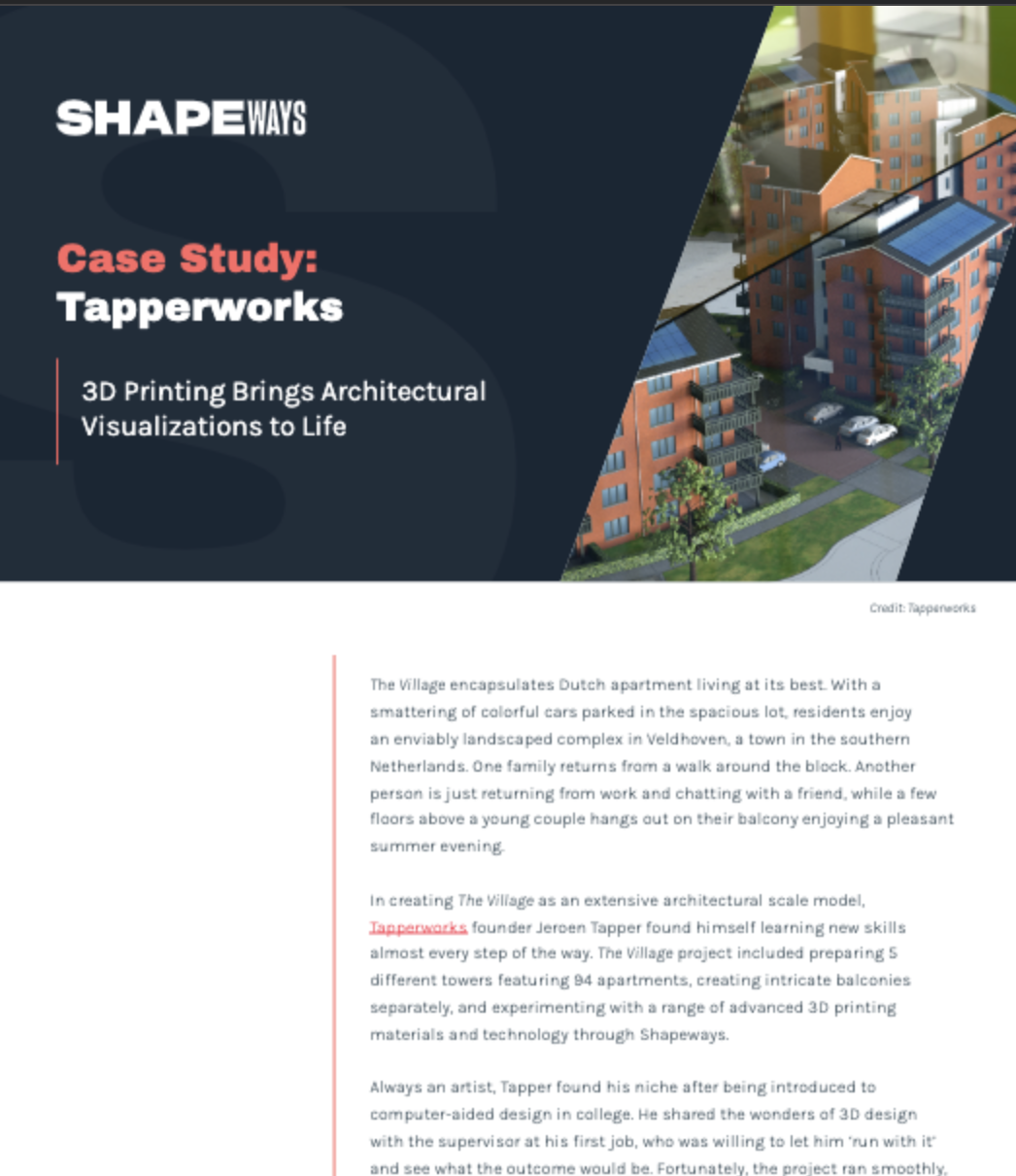 Dutch Architectural Vizsualizer and founder of Tapperworks, Jeroen Tapper, has been a Shapeways customer since 2016. Find out how the two companies came together again to 3D print The Village, one of the most challenging architectural design projects Tapperworks has completed to date.