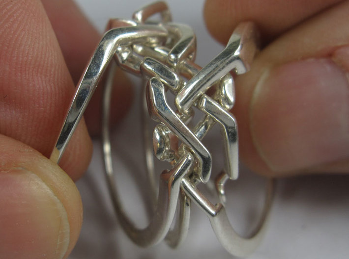 Indeed, what you’re looking at is one ring, designed by Oskar Puzzles. These interlocking parts all fit, stacked and snug, as one ring, and they were printed together as one piece. Certain cast metals, such as brass, are fantastic for printing interlocking parts. Which means you can print moving parts of a machine — or puzzle rings!