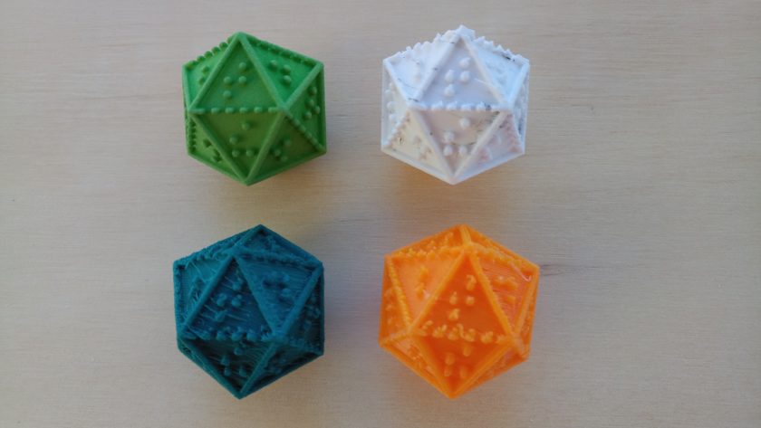 “Basically, I rolled the Shapeways printed d20 and a Game Science d20 500 times each through a dice tower,” Berberette states, “The results were pretty amazing. There is a 5% chance for a d20 to land on any side, and based on my rolls (which are not scientific) the Shapeways dice (probably due to a larger surface area) deviated from the 5% by only 0.58%. Meanwhile, the Game Science d20 deviated by 0.82%. Again, I’m sure the Game Science die is way more precise, but the Shapeways die performed really well.”