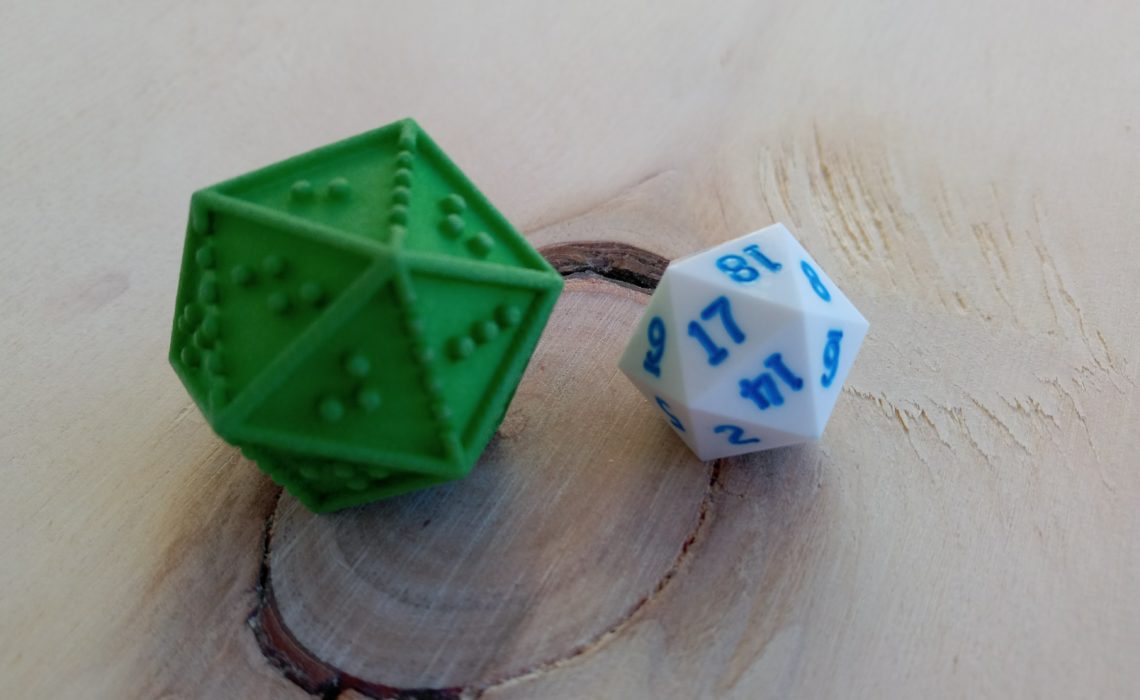 “I taught myself braille and raised money for a braille embossing printer and translation software. And I began translating small gamebooks and other gaming aids into braille. This was a great start, and was definitely raising awareness, but I discovered that braille dice weren’t really available.”