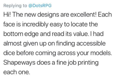 Want to help? Do you know a visually impaired player that could use some dice? Berberette says he’ll do whatever he can to get them out to them. “We have a Dice Sponsor program. Through this, people who would like to sponsor dice can simply order dice from our Shapeways shop. And they can mail them directly to me, and I will get them to those on the waiting list. We also take PayPal donations and any funds we raise will go to the design, purchasing, and distribution of accessible gaming materials.” Details can be found on the DOTS RPG Project “Heroes Wanted!” page.