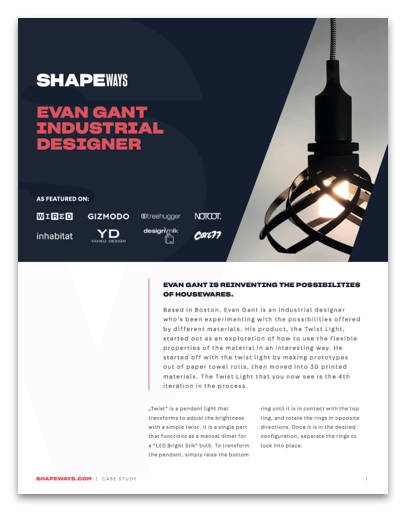 Boston designer Evan Gant used his background in industrial engineering to take on 3D design with a Twist—literally—in the form of an elegant light that also serves as a manual dimmer. The 3D printed pendant Twist List was born as Gant experimented with flexibility in the range of materials available for industrial grade 3D printing.
