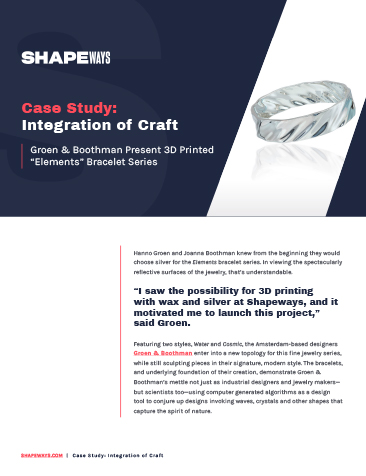 Dutch designers Hanno Groen and Joanna Boothman relied on the power of 3D printing to nurture a line of 3D printed bracelets into existence, cast in silver by Shapeways. Each bracelet is a stunning one-of-a-kind luxury keepsake, polished to perfection for hours, and sometimes even days.