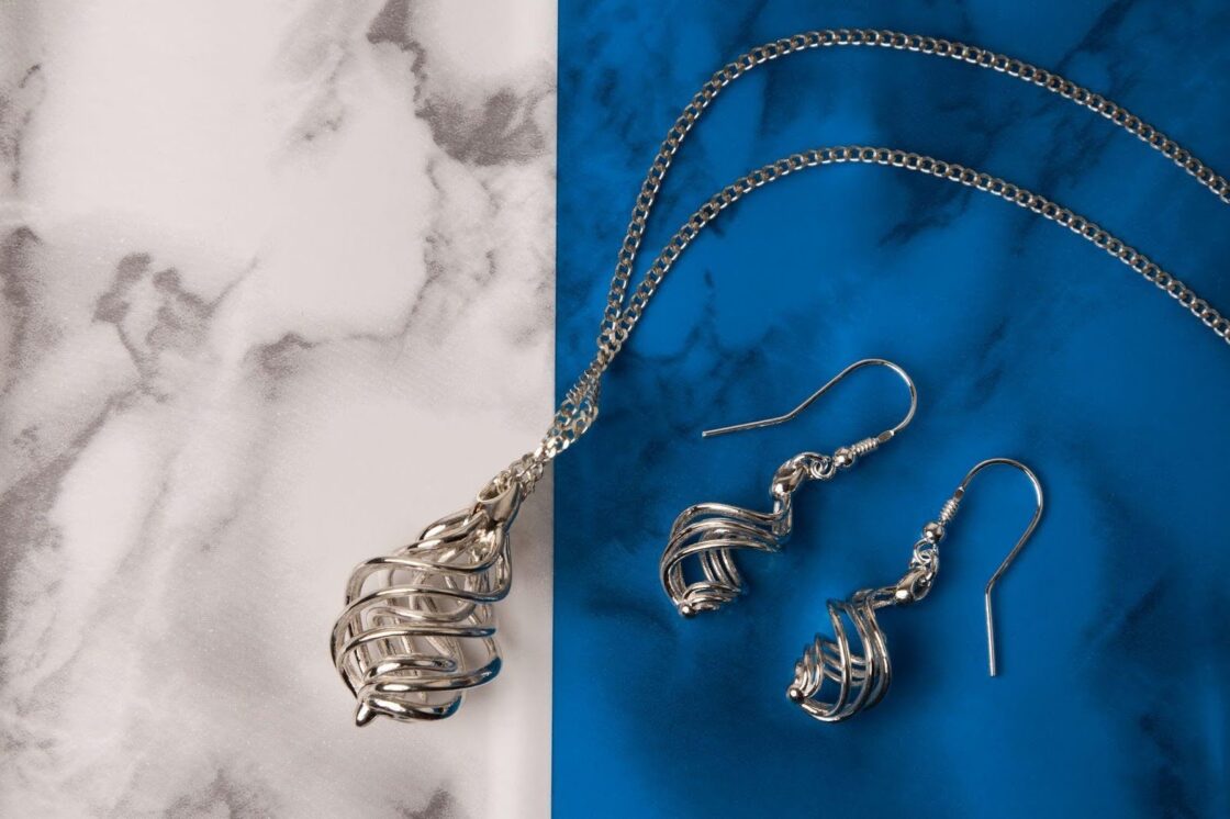 ‘Convolute’ pendant and earrings: The Convolute pendant inspiration came from the DNA helix. Wesley shaped the helix in the shape of a teardrop visualizing the DNA we share with every drop shed. This is one of the first designs he made and is the all time best seller. First published in 2012 under the name DNA Teardrop pendant, made in Polished Silver.