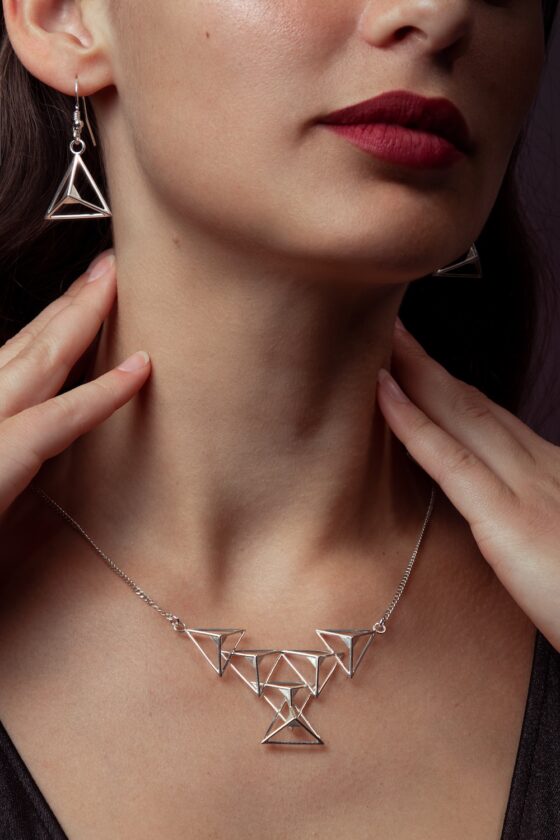 ‘Trigon’ necklace and earrings: Inspired by Wesley’s love for the ancient pyramids, made in Polished Silver released in 2024.