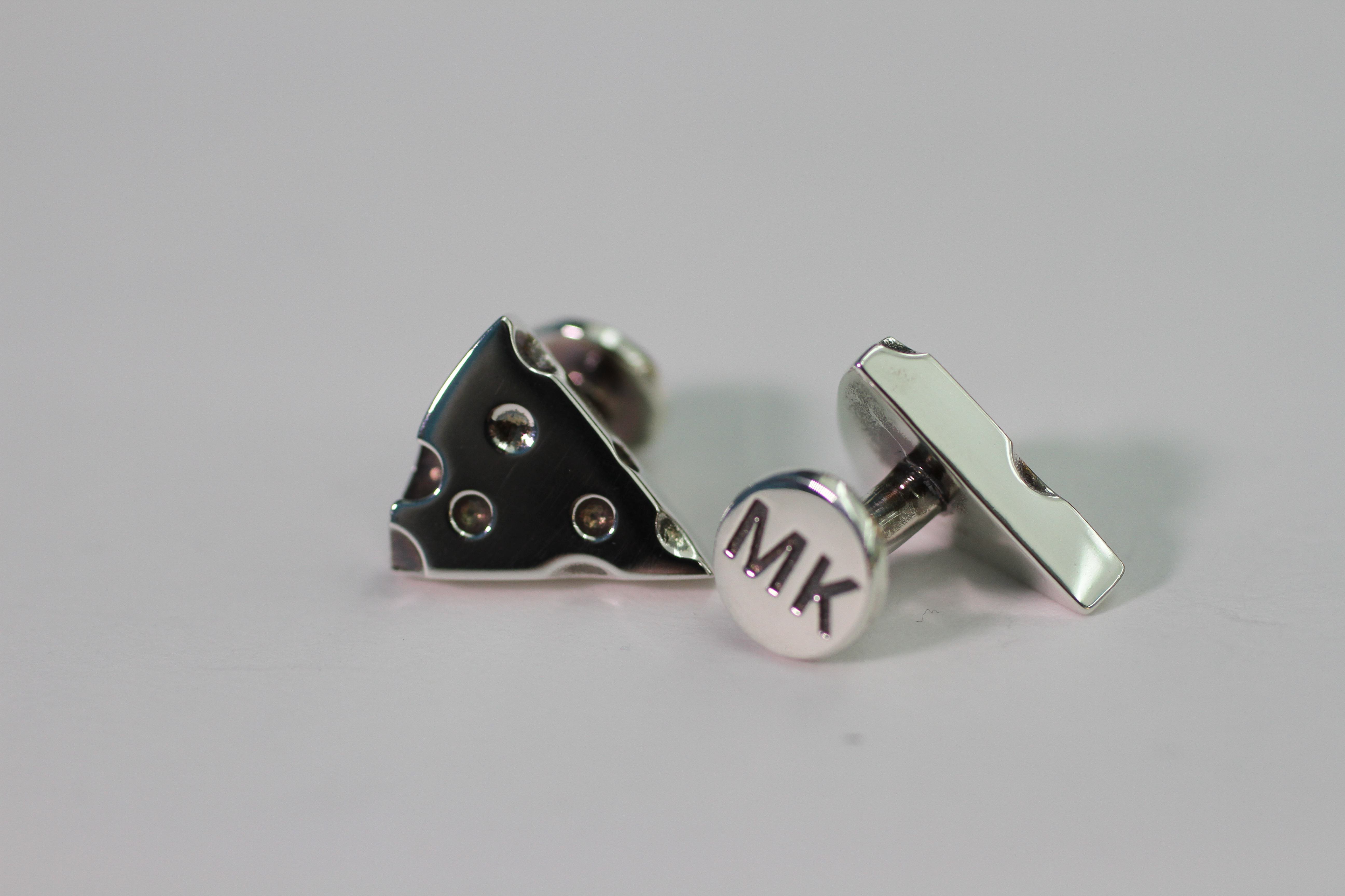 I realized after making the first cufflink that the stem should be oriented +/- 90° from the drawing here so that the cheese is pointed forward when actually worn. You should have everything rotated going forward if you’re making the same.