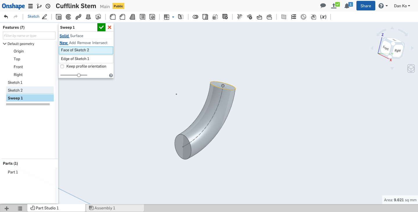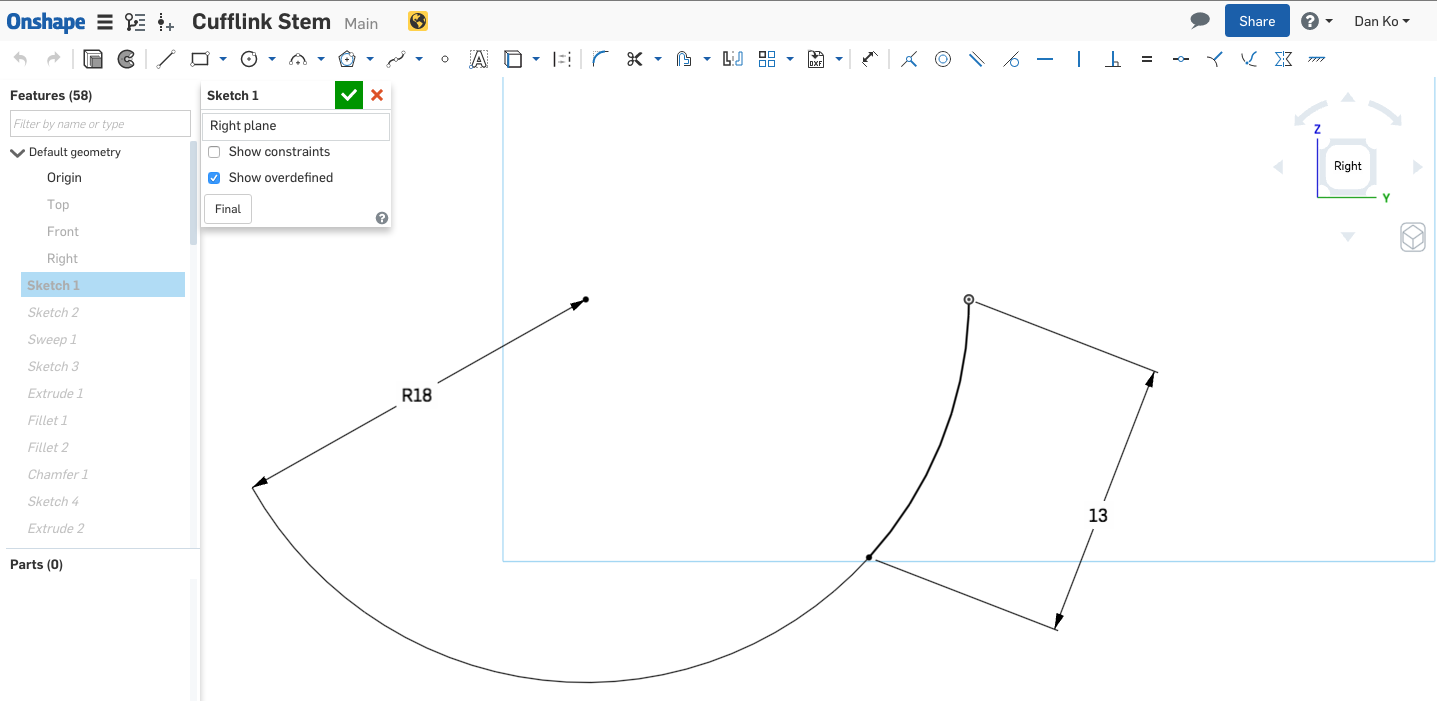 First, to create the stem that connects through the cuff, I started by sketching a gentle arc in the Right plane using the Center Point Arc tool, starting at the origin.