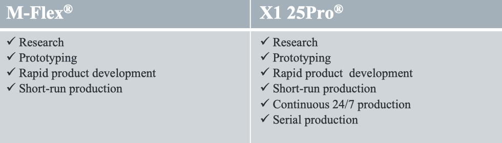 Both the M-Flex and X1 25Pro are used to 3D print metal powders, but the M-Flex is equipped with an ACT system for advanced compaction in printing fine powders down to 15 micron powders, while the X1 25Pro prints down to 5 microns and is also part of a beta program for Stainless Steel 316L—currently being 3D printed mainly on the M-Flex.