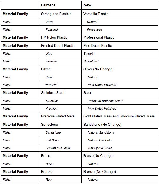 As a part of our new and improved materials experience, we have made several updates to the names of our materials. We believe these new names better represent the end value and hope these will help you choose the best material for your next project.