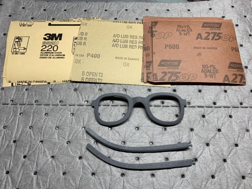 3D printed eyeglass frames in MJF PA12, 220/400/600 grit sandpaper (Photo by The Super Maker Bros)
