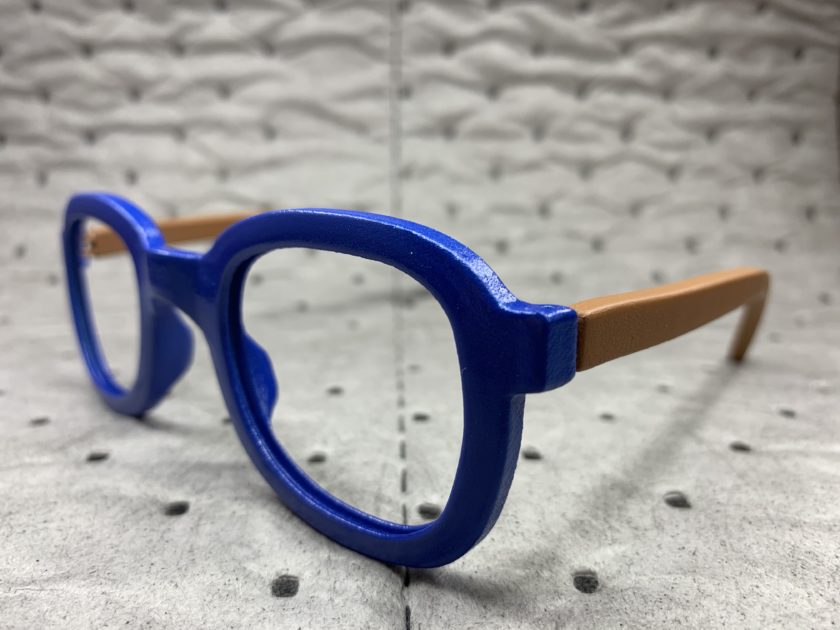 3D printed eyeglass frames, painted in blue and brown (Photo by The Super Maker Bros)