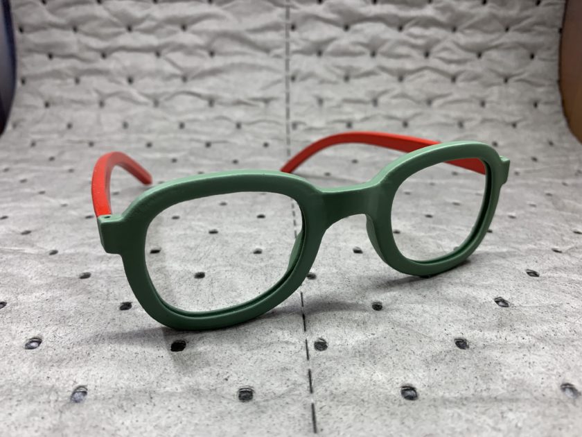 3D printed eyeglass frames, painted in green and red (Photo by The Super Maker Bros)