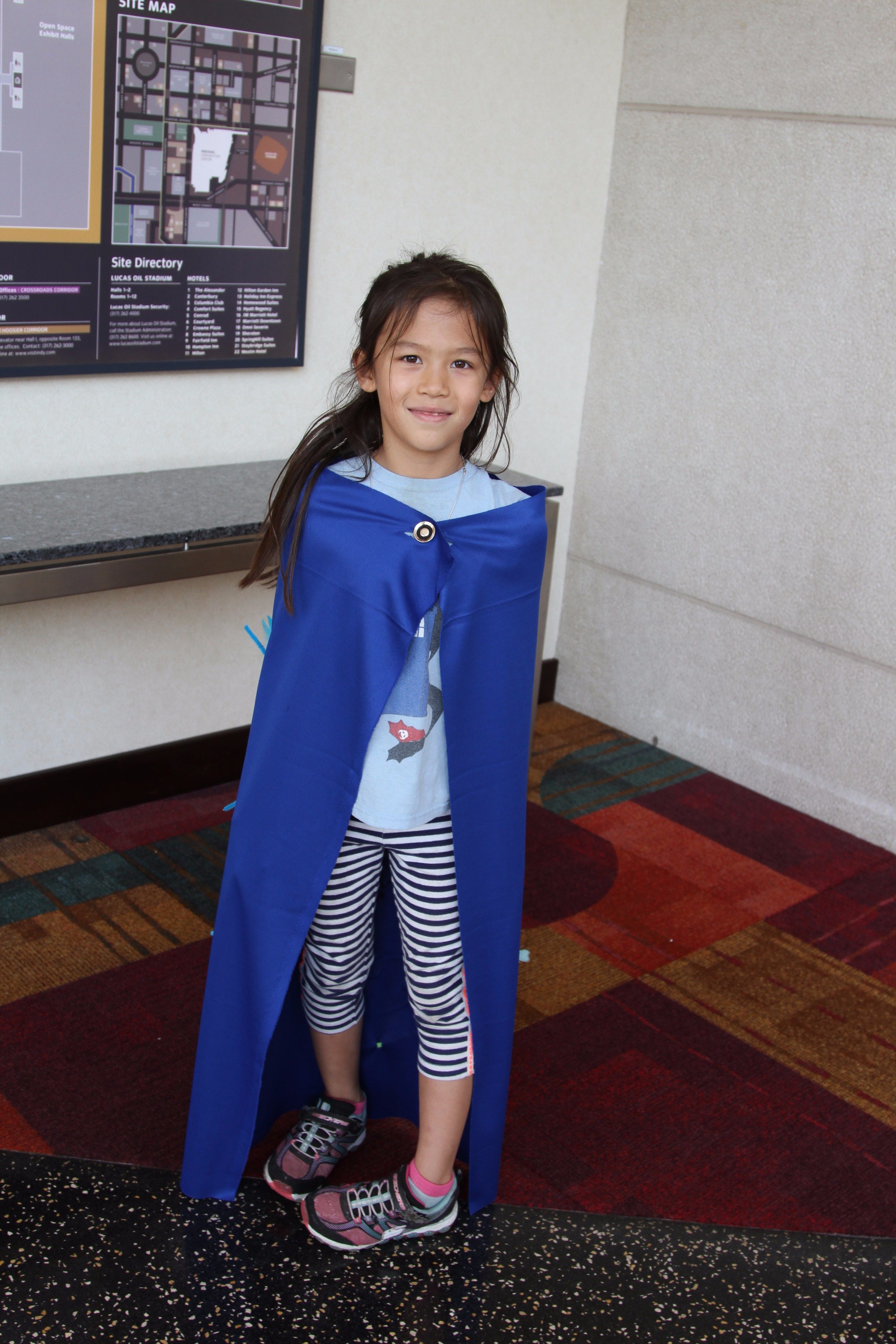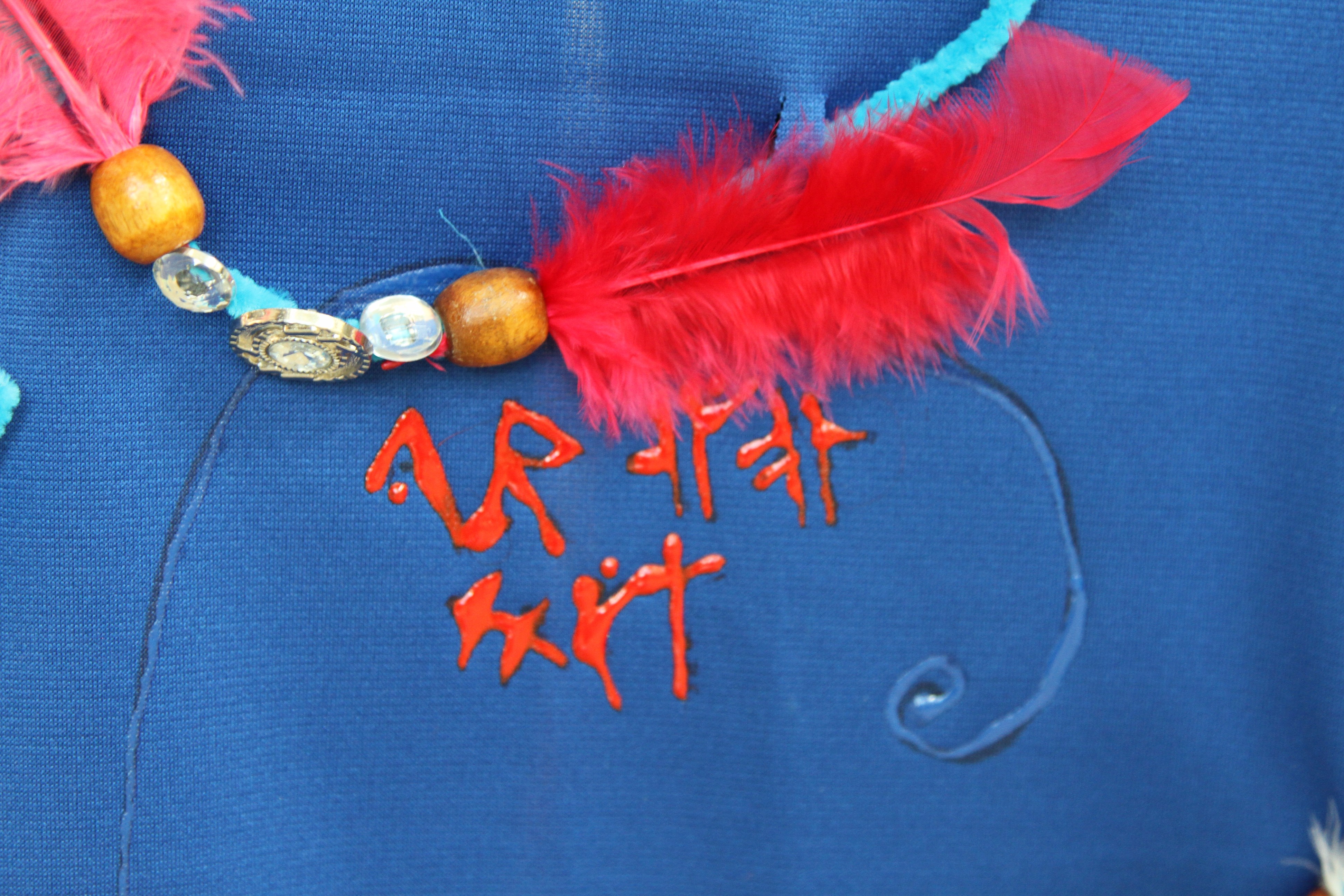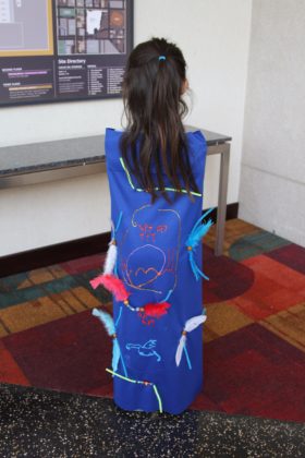Zoe created a cape and wrote her own name, “Mom”, and “Dad” in Norse. The design was of her own creation and featured puffy paint, feathers, and pipe cleaners.