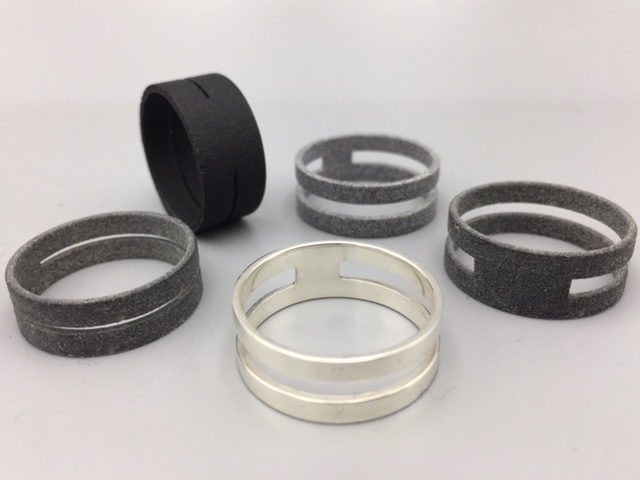 Late in 2017 I designed some prototypes in Fusion 360 and sent them out to see what looked good, finally settling on a design that looks a lot like two copies of our current wedding rings, with a secret connection in the back. I’ve been wearing around an HP nylon prototype of the ring for a few weeks and I really love it. Here’s what the prototypes look like, and most recent design in silver.