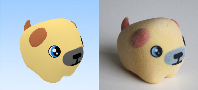 I had been experimenting with Full Color Sandstone (FCS) a little bit and I decided to start designing from the constraints of the medium. I wanted the model to be cheap and hollow, so I went for a round body and short legs. I spent maybe half of the design time on the base body mesh, looking for simple and generic shape that would allow many different parts to fit on. I wanted room for facial features, knowing that this is where most of the fun would come from, so I kept the head big. Most of the parts of the pup do not overlap, so they could be designed and tested independently.